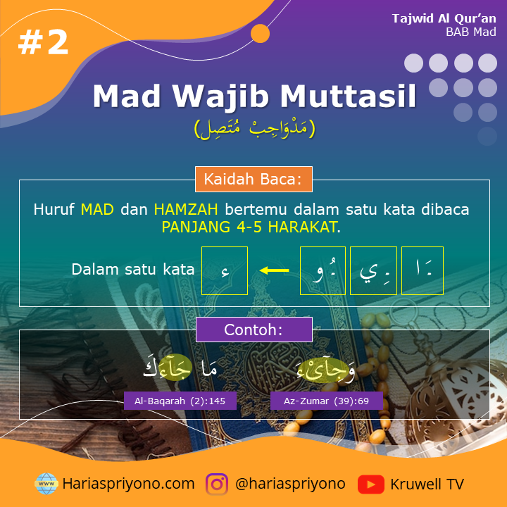 Kaidah Baca: Huruf MAD dalam suatu kata bertemu HAMZAH di kata lainnya dibaca PANJANG 2, 4 atau 5 HARAKAT.