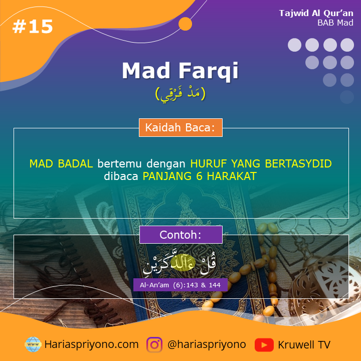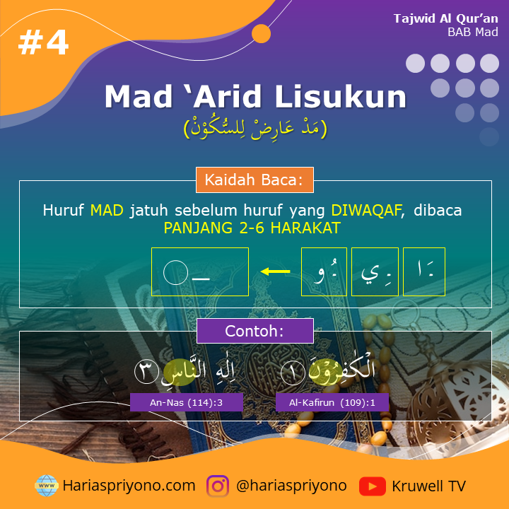 Kaidah Baca: Huruf MAD jatuh sebelum huruf yang DIWAQAF, dibaca PANJANG 2-6 HARAKAT.