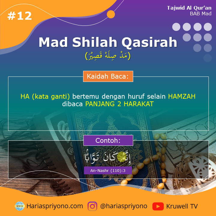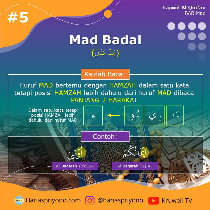 Kaidah Baca: Huruf MAD dalam Al-Qur’an yang tidak bertemu dengan HAMZAH, SUKUN, WAQAF, TASYDID atau sebab lainnya dibaca PANJANG 2 HARAKAT.