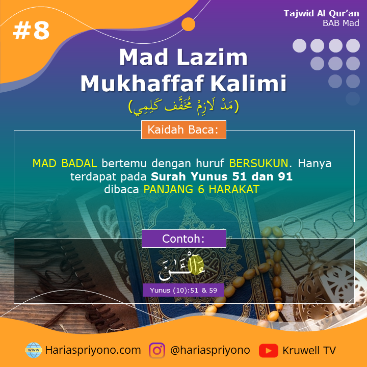 Kaidah Baca: MAD BADAL bertemu dengan huruf BERSUKUN. Hanya terdapat pada Surah Yunus 51 dan 91 dibaca PANJANG 6 HARAKAT.