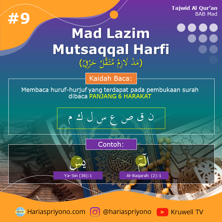 Kaidah Baca: Membaca huruf-hurjuf yang terdapat pada pembukaan surah dibaca PANJANG 6 HARAKAT.