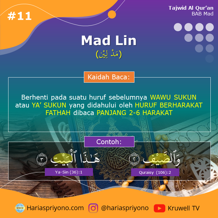 Kaidah Baca: Berhenti pada suatu huruf sebelumnya WAWU SUKUN atau YA’ SUKUN yang didahului oleh HURUF BERHARAKAT FATHAH dibaca PANJANG 2-6 HARAKAT.