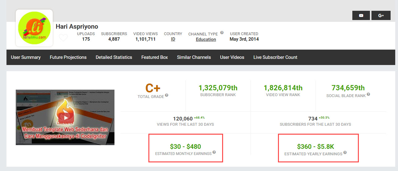 Nah dari tampilan hasil analisis channel hari aspriyono ini, kalian bisa lihat estimasi pendapatan per bulan dan per tahun.