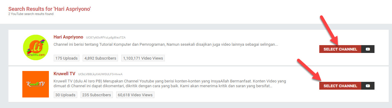 Selanjutknya klik icon search atau tekan Enter. Pada tampilan hasil pencarian biasanya menampilkan daftar channel terkait. Misal kan hasil pencarian nama channel “Hari Aspriyono“, hasil pencarian yang muncul ada 2 channel yaitu “Hari Aspriyono” dan “Kruwell TV” seperti pada gambar di bawah ini.