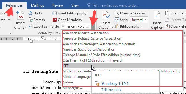 Dalam memilih style pastikan style yang dipilih adalah style yang sesuai dengan aturan yang telah ditetapkan pada karya ilmiah, Misalkan IEEE, dan lain sebagainya. Selanjutnya semua referensi yang telah dikutip dicantumkan pada daftar pustaka dengan Cara Membuat Daftar Pustaka Secara Otomatis pada Microsoft Word dengan Mendeley.